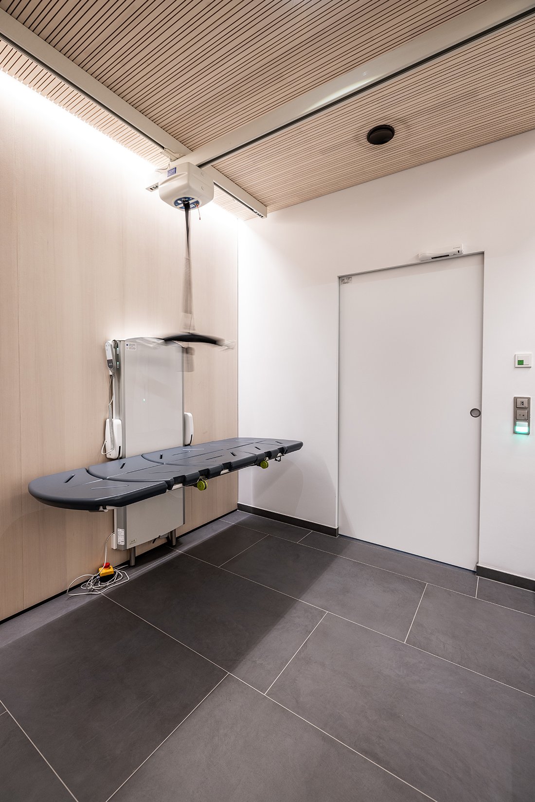 • eine höhenverstellbare Pflege- und Versorgungsliege