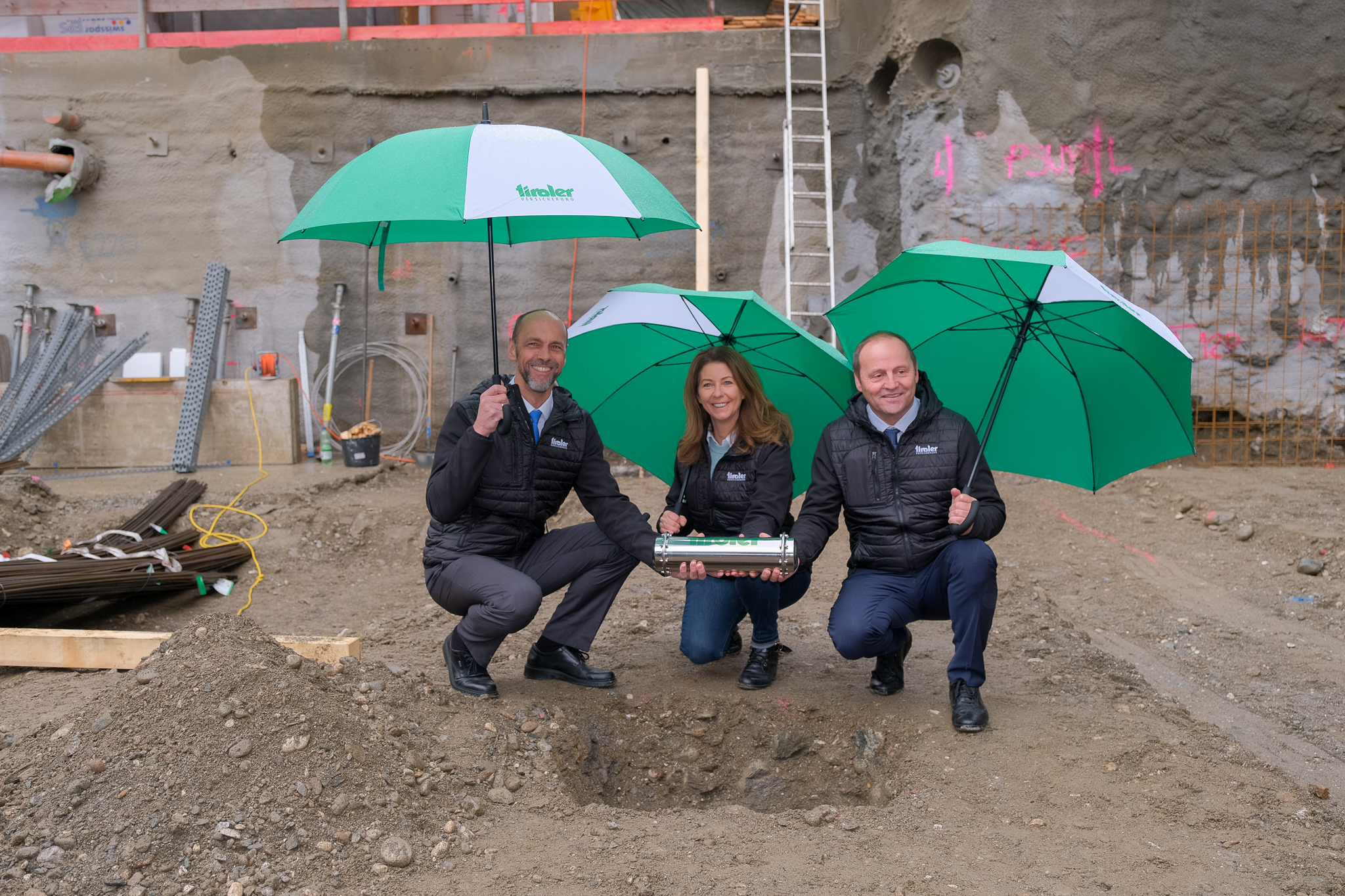 Die Grundsteinlegung war auch der perfekte Anlass für den Vorstand der TIROLER, um eine Zeitkapsel zu versenken. Der Inhalt? Die Statuten der TIROLER, in denen die Grundsätze des Vereins auf Gegenseitigkeit festgelegt sind sowie das Magazin „Grün“, das die Vision des Projektes festhält.