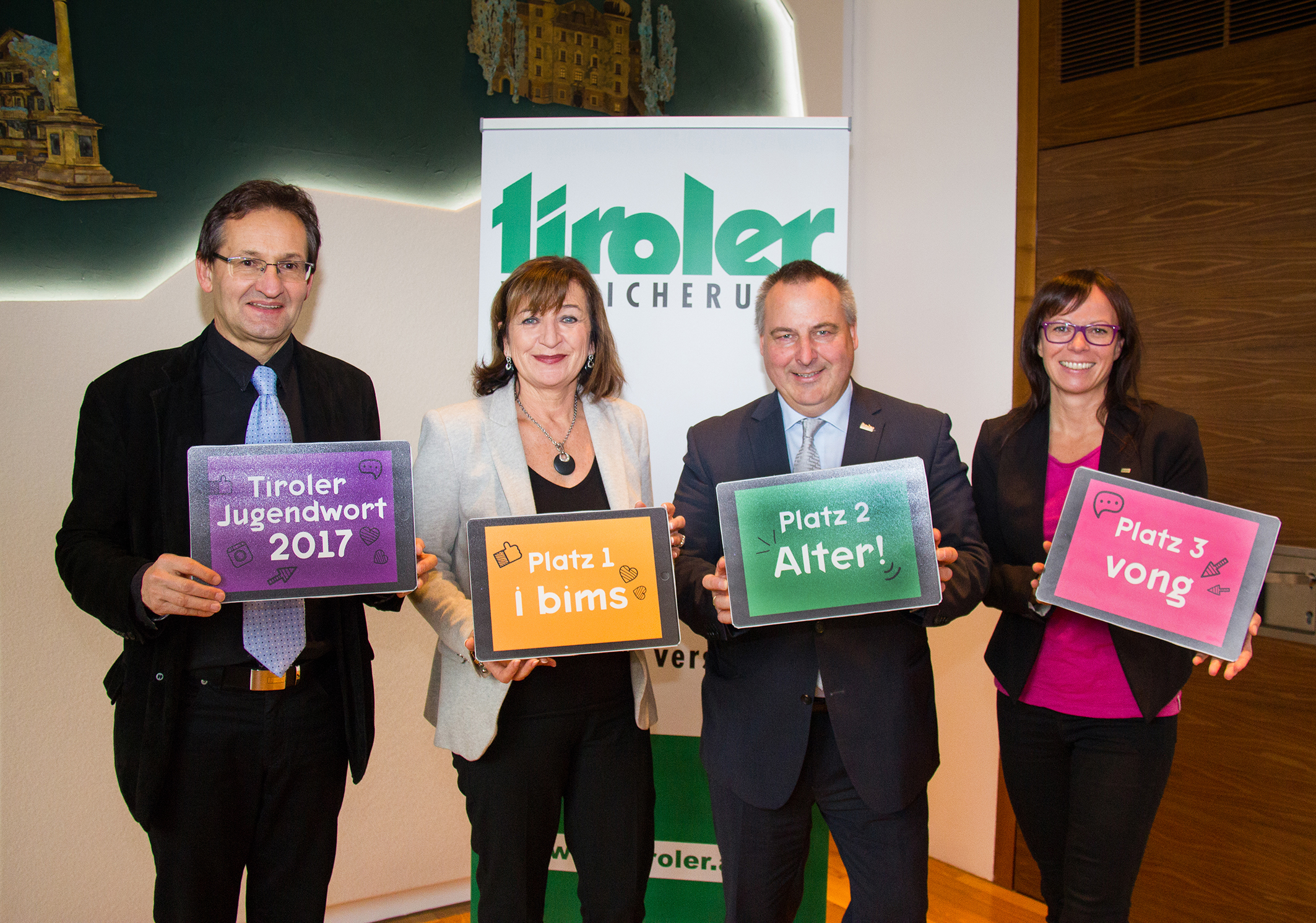 Der Vorjahressieger „bae“ (Abkürzung für before anything / anyone else) ist nicht nur von „i bims“ abgelöst worden, sondern ganz von der Bildfläche verschwunden. Der zweite Platz konnte sich im Vergleich zum letzten Jahr allerdings halten, denn die Schülerinnen und Schüler stimmten erneut am zweithäufigsten für „Alter“. Auf Platz 3 rangiert „vong“, ein Wort, das für die Präposition „von“ steht und häufig im selben Kontext wie „i bims“ eingesetzt wird (Vong-Sprache). „In der tirolweit durchgeführten Initiative von Landesschulrat, Tiroler Kulturservicestelle und TIROLER VERSICHERUNG haben rund 300 Jugendliche zwischen 10 und 18 Jahren ihr Tiroler Jugendwort 2017 eingeschickt. Die Einsendungen stammen aus allen Tiroler Bezirken und aus über 100 Schulen, von Neuen Mittelschulen und Gymnasien über Berufsschulen bis hin zu HAK und HTL“, weiß Prof. Mag. Kurt Arnold von der Tiroler Kulturservicestelle.